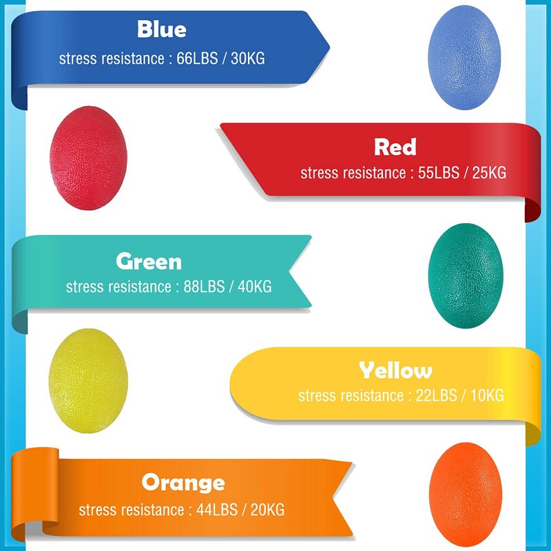 - Five strengths levels - This package comes 5 hand therapy balls with different colors and 5 types strengths levels are contained. The color coded set includes yellow(extra soft), orange (slightly soft), a red (moderately hard), blue (firm resistance), green(extra firm). Please choose a suitable resistance according to your own need. Fit for men, women and children.