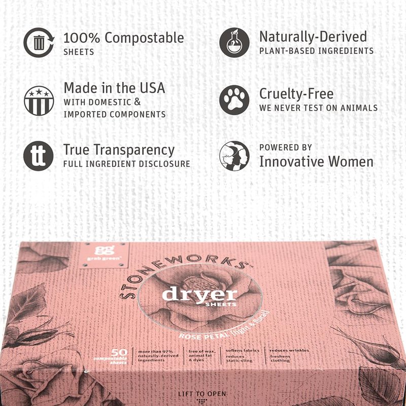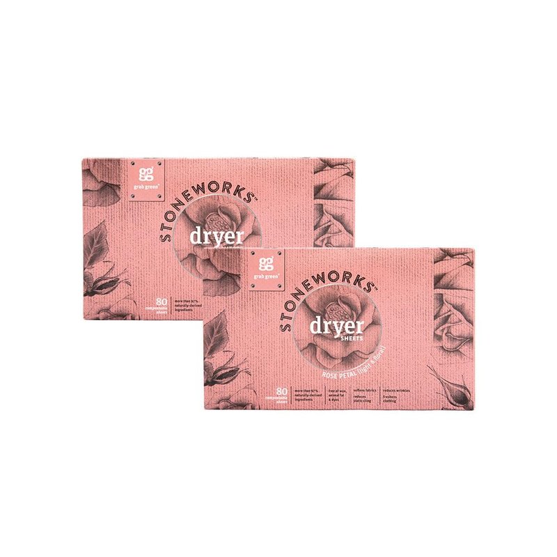 Grab Green Stoneworks Dryer Sheets, 160 Sheets, Rose Petal Scent, Plant and Mineral Based, Softens Fabrics, Reduces Static-Cling and Wrinkles, Freshens Clothing