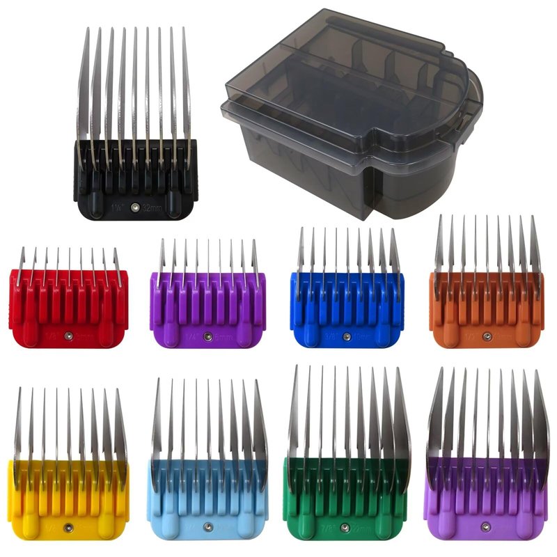 - Package Included: Set of 9 stainless steel guide combs for pet grooming and a storage box .