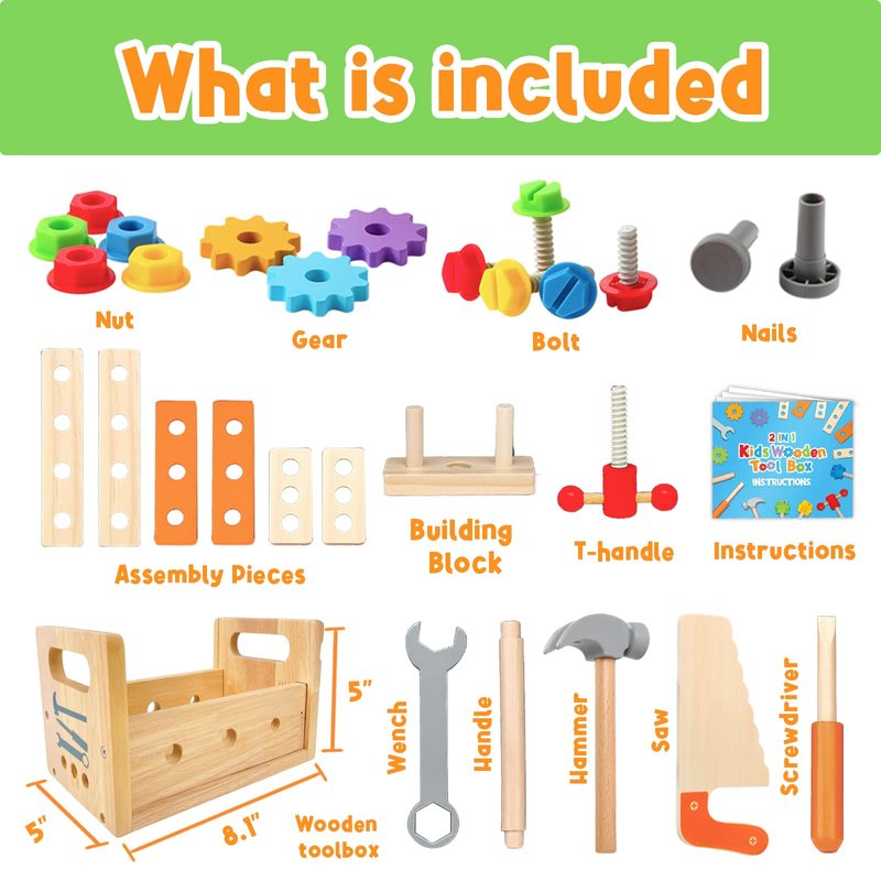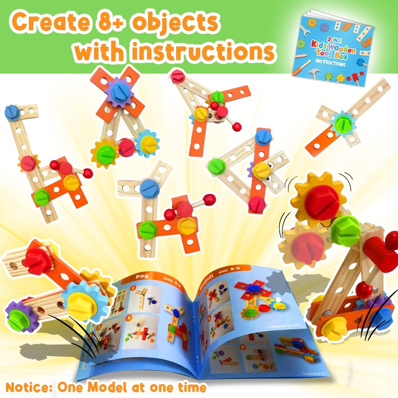 - 🛠️3 IN 1 WORK BENCH STATION - montessori toys for 2 year old Our construction wooden toys box toy combined 3 main play features: pounding, twisting, & sawing. Kids can also pretend to play and build at least 8 different objects like an aircraft, a scooter, a windmill or more. There are unlimited possibilities waiting for your kids to discover!