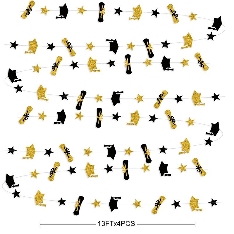 - 🍷Package Include:4 strings of 13 feet black gold graduation cap diploma star banner garland, totally 52 feet. Great for 2023 graduation party decorations!