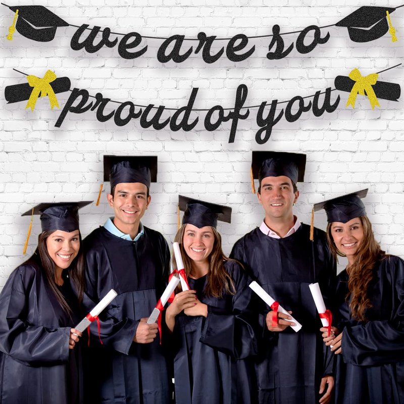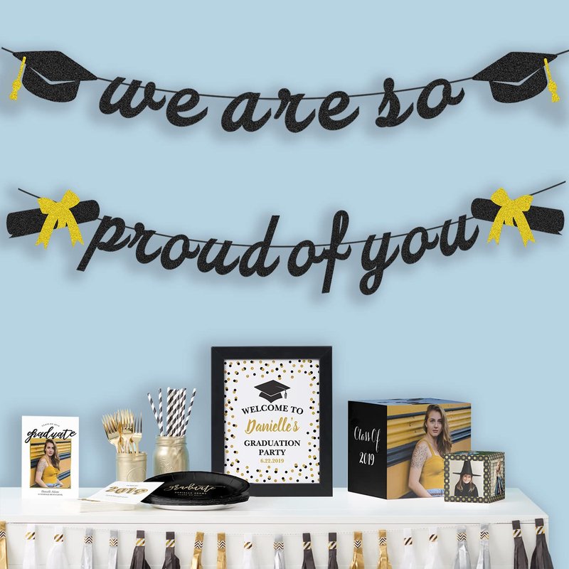 Do you want eye-catching graduation decorations and make an unforgettable memory? - Our graduation party decorations pack will meet your needs absolutely. High quality items, any questions or you still have dissatisfaction with our products, please feel free to contact us! We will help you all the time! PRE-STRUNG - NO DIY - We have done that for you! Now just enjoy your graduation party! We Are So Proud Of You banner with Diploma and Graduation Cap Decorations: - PRE-STRUNG 1, Material: Eco-Friendly cardstock. 2, Color: Glittery black and gold, add real sparkle to your party. 3, Large Size: The length of letter is approx. 6.7"(17 cm). MUST HAVE FOR GRADUATION DECORATIONS: - Specially designed, premium high quality Graduation party decorations. Perfect for graduation party decorations 2024, graduation decorations class of 2024, graduation decor, graduation party supplies, graduation backdrop, congratulations banner, graduation photo banner, masters graduation decorations, congrats grad sign, class of graduation sign. - It's time to a make cool and happy atmosphere for your graduation celebrations!