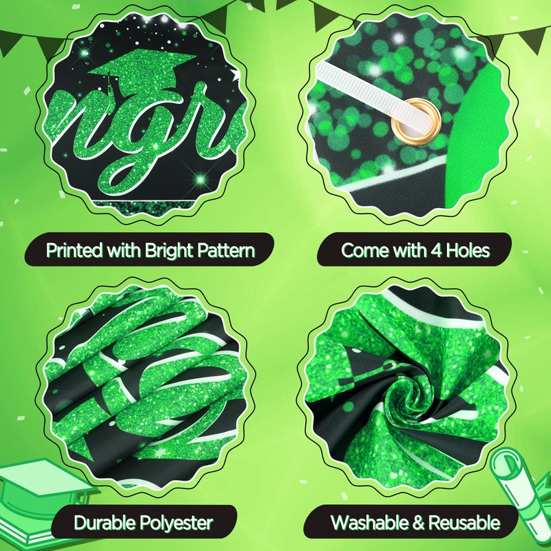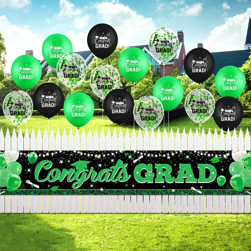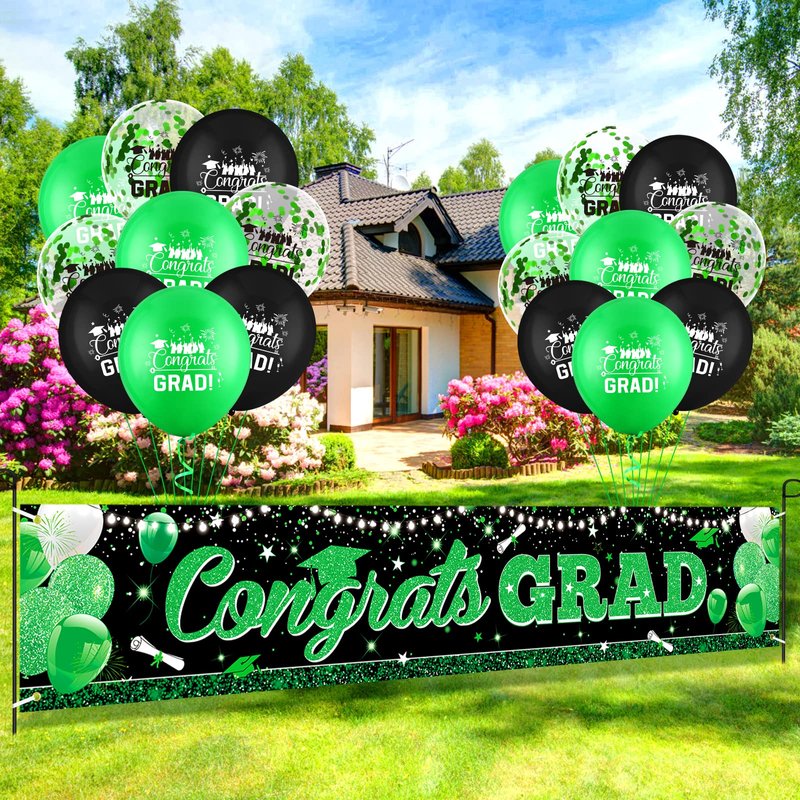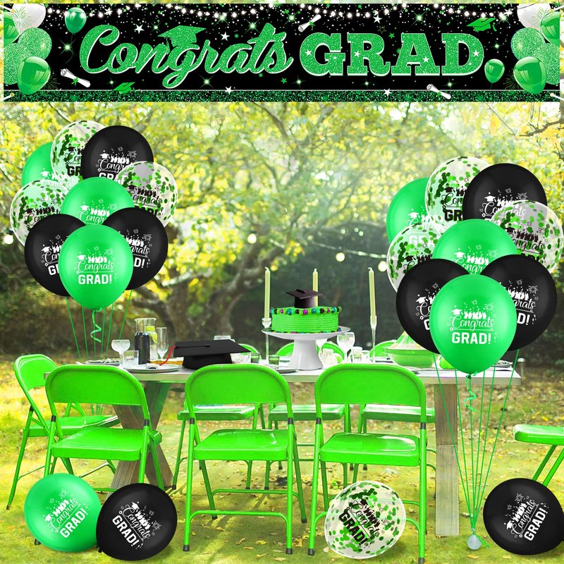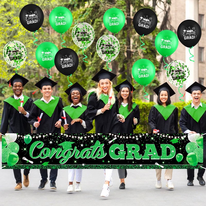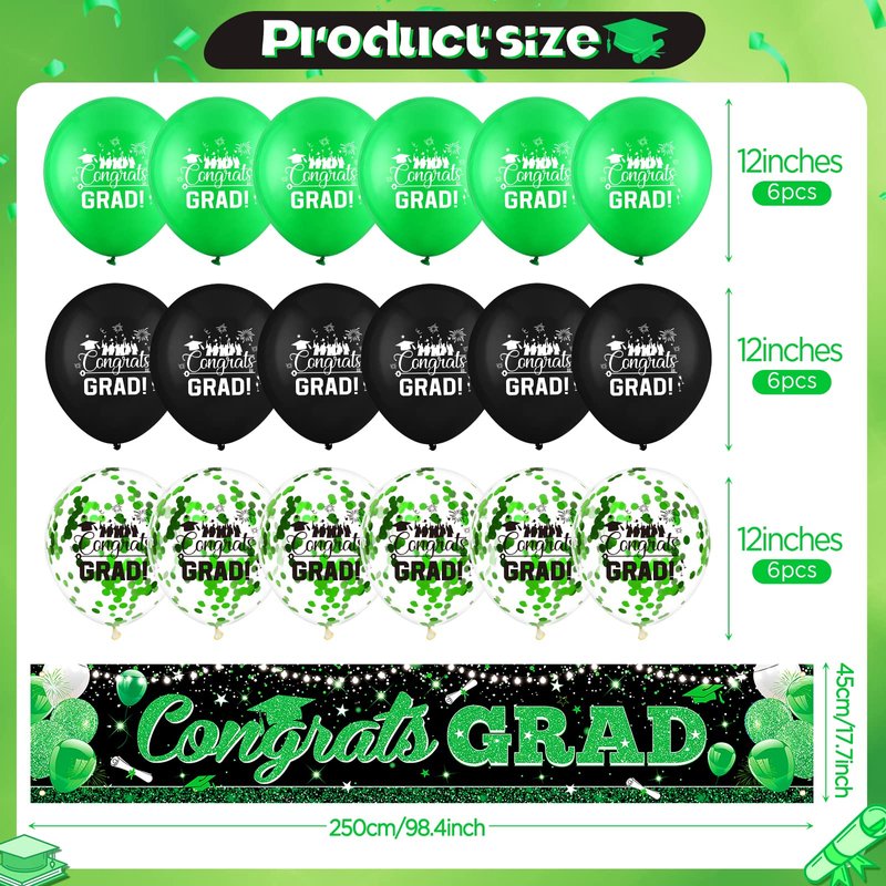 - 🍭GRADUATION BANNER BALLOONS SET: There is 1pcs graduation green black banner. And we will give you 18pcs colorful graduation balloons with "congrats grad" patterns.(6pcs green graduation balloons and 6pcs balloons with green sequins and 6pcs black congrats grad balloons ) With these so many colorful graduation balloons, they further set off a atmosphere of graduation party.