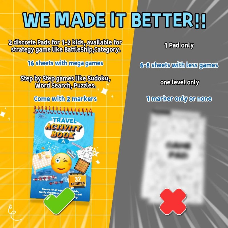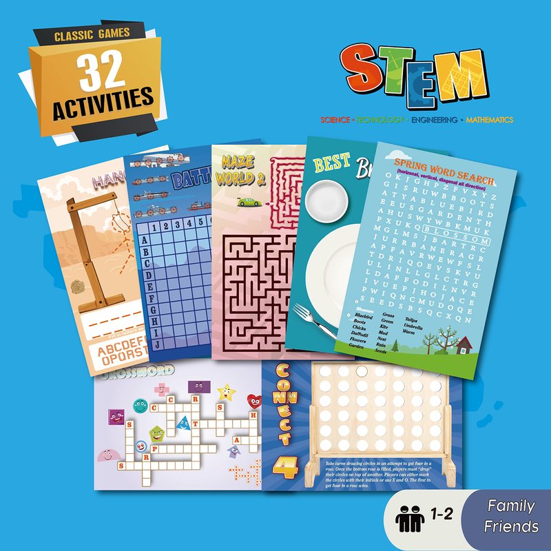 - 32 Activity Pads: Including mega popular educational games like Tic-Tac-Toe, Connect 4, Battleship, Hangman, Puzzle, Sudoku, Word Search, Categories, Sketch practice and more. Get these fun games once for all in 2 pads. Travel sized fit well in your purse or glove compartment.