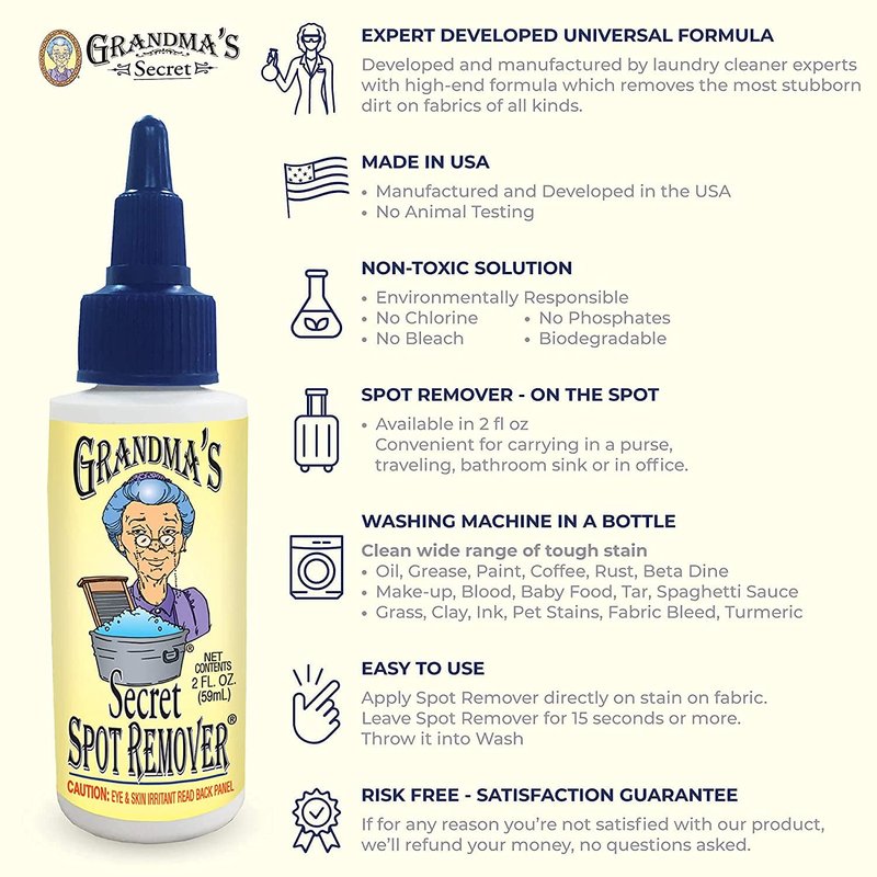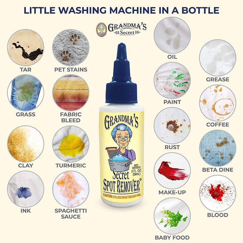 - ✅ EFFECTIVE: Grandma s secret spot remover can be used on blood, food stains, grass stains, pet stains, iodine, beverages (coffee, tea, wine, milk, cola, etc.), crayon, uncured latex paint, chocolate, raw egg, candle wax, heavy grime, ketchup, grease, oil stains, most shoe polishes, much more and the Grandma secret spot remover formula works in all water temperatures.
