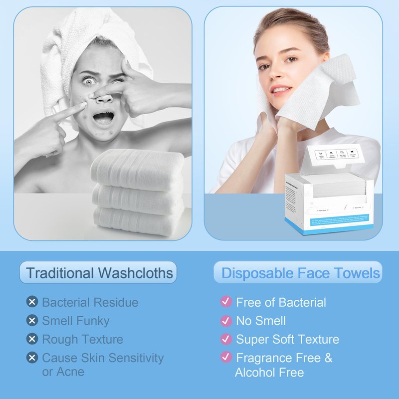 - Healthy & Bacteria-free - Ordinary cotton towels left to dry after one use can accumulate bacteria, mites, dead skin cells, etc., causing dry skin, inflammation, and acne. Our XL disposable face towels are chemical-free, 100% natural, odorless, cruelty-free and hygienic face towels suitable for all skin types, especially sensitive skin! A healthier alternative to paper towels, cotton pads and traditional cotton towels, our cotton wipes come in a high-quality carton for easy access and hygiene.