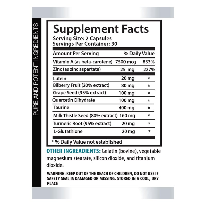 - ADVANCED VISION FORMULA OVERVIEW: Introducing the Advanced Vision Formula, a powerful blend of premium ingredients meticulously formulated to support and enhance your eye vision functionality. Our carefully crafted formula combines essential nutrients and natural extracts, including Vitamin A, Zinc, Lutein, Bilberry Fruit, Grape Seed, Quercetin Dihydrate, Taurine, Milk Thistle Seed, Turmeric Root, and L-Glutathione.