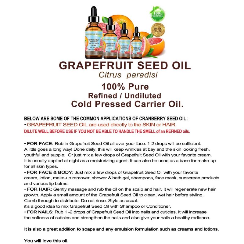 GRAPEFRUIT SEED OIL is currently considered to be the best oil for natural, anti-aging skin care products with restorative properties for all skin types, especially for dry or mature aging skin, chapped and cracked skin, balances the moisture in the skin, and leaving skin soft and smooth.Use topically for damaged skin like BURNS, WOUNDS, CUTS, SCARS, ITCHY, SCALY, ACNE SCARS, DRY SKIN, CRACKED SKIN, Cracked Hands, CHAPPED LIPS, CELLULITE IRRITATED SKIN CONDITIONS SUCH AS ECZEMA and PSORIASIS.