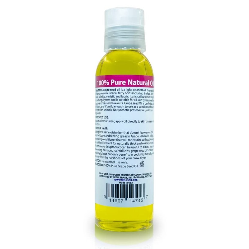 Well's 100% Grape seed oil is a light, odorless oil. This versatile oil has numerous essential fatty acids including linoleic, oleic, stearic, palmitic, myristic, and lauric. Its rich silky texture is perfect for soothing dryness and is suitable for all skin types since it won't clog pores or cause break-outs. Grape seed Oil is perfect as a base for lotions, and it's mild enough to use as a conditioner for all hair. Not tested on animals, Well's Grape seed oil does not contain artificial synthetic preservatives, fragrances, or colors.