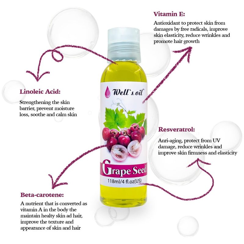 GRAPESEED OIL | 4oz(118ml) | All-Natural | For Hair + Skin + Nails | Moisturizer and Sensitive Skin | Refined, Cold Pressed | All Skin Types | by Well’s Oil