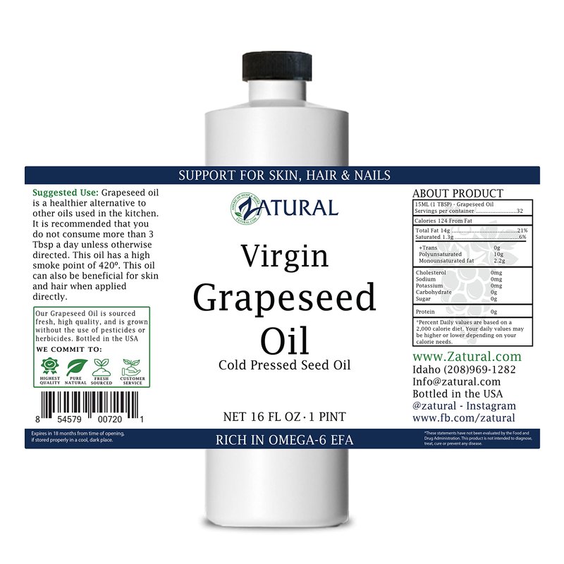 Here at Zatural, we strive to provide the best all-natural products. Our Grapeseed oil comes from organically grown grapes from Italy. We only source the highest quality products and sell them at affordable prices. Grapeseed oil is made from the seeds found in grapes. Grapeseeds are usually gathered after the grapes have been pressed for wine or grape juice. Our oil is produced by a process called cold pressing. This process is free of chemicals like Hexane, which is commonly used to gather grapeseed oil. Our Grapeseed oil is food and therapeutic grade and available in various sizes.