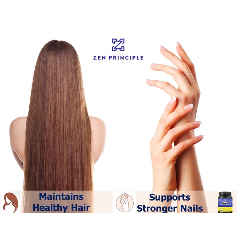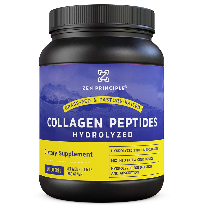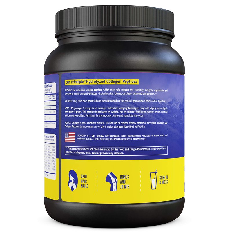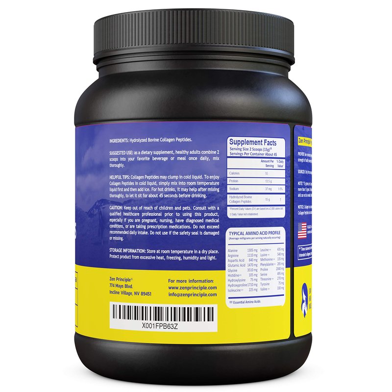 Available in 2 sizes. Using leading edge research and manufacturing techniques, we created a proprietary collagen peptide blend packed with pure type 1 and 3 collagen and essential amino acids, which easily dissolves in cold or warm liquids. Our hydrolyzed collagen powder was designed specifically to support Bulletproof, Paleo, Primal, GAPS, Whole 30 and Ketogenic (Keto) plans. Note: While Beef Collagen is generally easy to digest, doesn't cause bloating and is hypoallergenic, it's advised to start with a small amount such as 1 teaspoon per day to confirm that you have no issues with it. Servings per day can be increased over time after that. Benefits An Essential Part of Your Healthy Diet.Hydrolyzed Collagen Peptides are short-chain amino acids which are ‘cell-ready’ (easily digested) and easy to mix into cold and warm drinks. Peptides are crucial to maintaining healthy skin, hair, nails, joints, and bones. Much More Effective Than Collagen Creams.Collagen powder taken as part of your healthy diet is far superior to topical creams or gels. Creams promise only a temporary cosmetic fix while increasing collagen in your diet will help the body from within, where it can provide real benefits. Rejuvenate your skin, hair, and nails naturally.Collagen production declines as we get older, resulting in wrinkles and less elastic skin. Increasing collagen levels can help your skin look firmer, smoother and more youthful. It can also help maintain sleek, shiny hair and stronger nails. Boost metabolism and energy.Collagen protein is critical to a healthy metabolism. Amino acids such as glycine can boost metabolism and increase energy levels. It also helps in muscle development which burn more calories than fat. Features We Source Only the Best Quality Bovine Peptides.Unlike other sellers, we use only grass-fed, pasture-raised cows from the nutrient-rich grasslands of South America. The cows are humanely raised and are free of harmful antibiotics, GMO-contaminated feed, artificial additives, etc. Our beef collagen is produced under strict quality and health guidelines and tested multiple times to ensure purity. FREE scoop included!Use our included scoop to make it easier to measure the amount you want to use and also reduce spilling or mess. 100% Money Back Guarantee.We want you to be happy with our bovine collagen peptides. If you are not for any reason, we'll gladly give you a full refund within 30 days. Recipes Collagen Berry Green Smoothie Recipe 1 tablespoon of Zen Principle Collagen Peptides 1 banana 1⁄4 cup water 1⁄2 cup frozen berries 1 tablespoon coconut concentrate 1 cup spinach ice cubes, optional to taste Place all ingredients in a blender and blend to combine. Add ice cubes if smoothie is not cold or thick enough. Enjoy your Collagen smoothie: mmmm! Collagen Post Flu Recovery Smoothie Recipe 2-3 tablespoons of Zen Principle Collagen Peptides 11⁄2 cups coconut water (Other options for mineral boosting fluid would be plain water with a big pinch of sea salt, or brewed nettle tea. The fruit will mask any flavor.) 3-4 tablespoons sweet potato mash or about 1⁄4 cup cubed and cooked sweet potato 1 banana, fresh or frozen 1 cup mango or papaya, fresh or frozen 2 tsp avocado oil or melted coconut oil Place all ingredients in a blender and blend until smooth. Serves 3 small child sized servings. Can also be poured into ice pop molds for popsicles. FAQ Beef Collagen Powder - Frequently Asked Questions