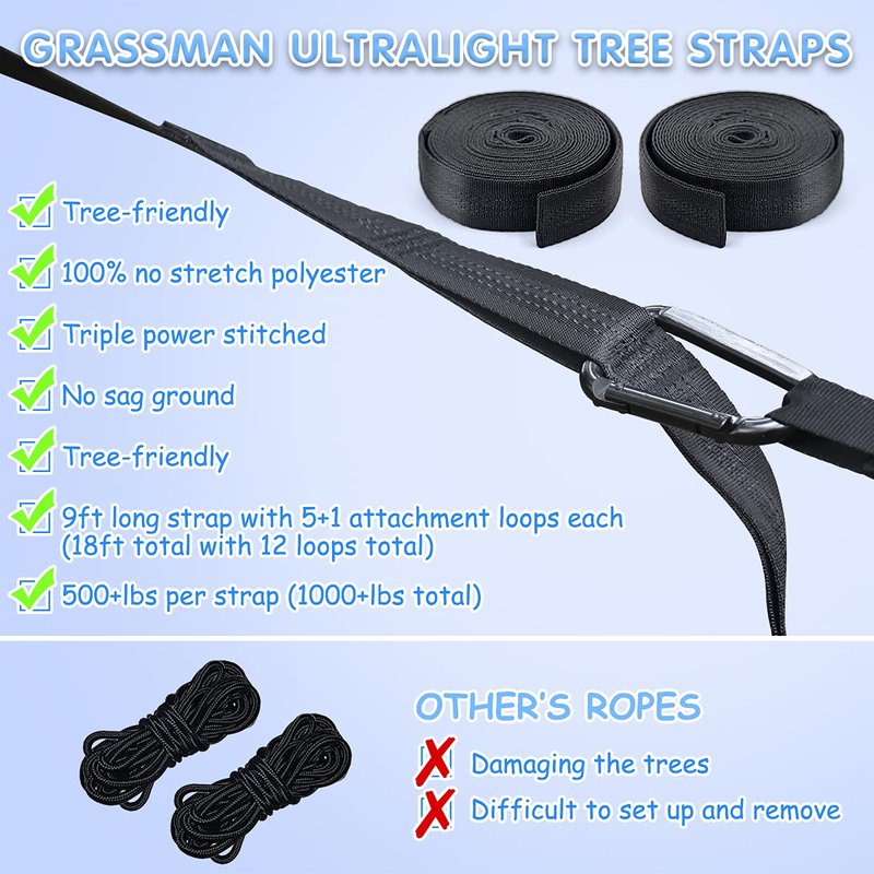 - DURABLE & SAFETY: GRASSMAN children's camping hammock made of 210T parachute fabric material, With anti-scratch carabiners holding over 300lbs, breathable, anti-fraying and anti-tearing. Our heavy-duty child hammocks are easy to clean and dry quickly, making maintenance a breeze.