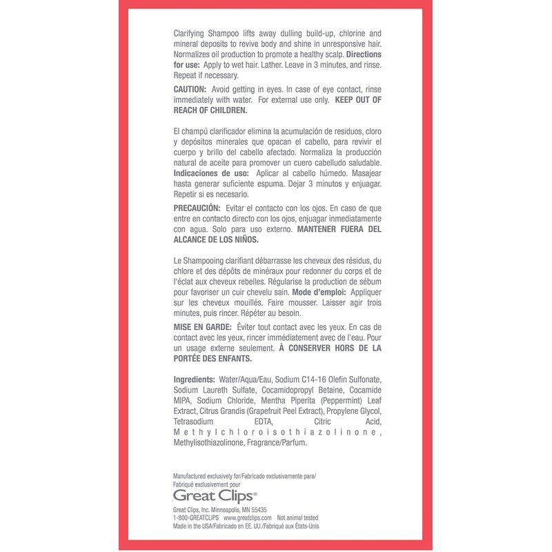 - RECOMMENDED USE: Use our clarifying shampoo by applying to wet hair, lather, leave on for 3-5 minutes and rinse. Use 2-3 times per week in rotation with your favorite Great Clips' shampoo.