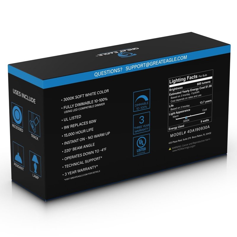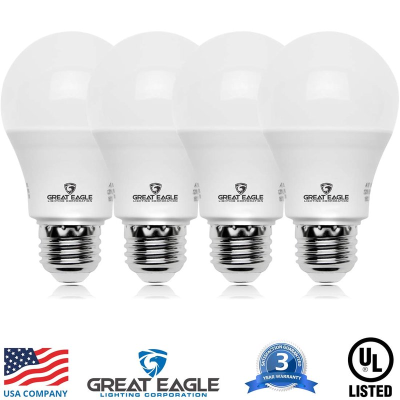 Great Eagle A19 LED Light Bulb, 9W (60W Equivalent), UL Listed, 3000K Soft White, 800 Lumens, Dimmable, Standard Replacement (4 Pack)