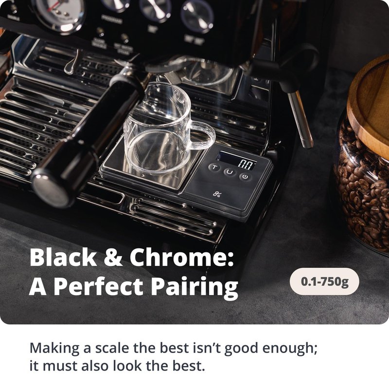 - Simple And Stylish: The Greater Goods espresso scale is functional and fashionable. It features a matte-black finish, chrome weighing sensor, and a high-contrast, reverse backlit LCD screen – perfect for weighing in high and low light.