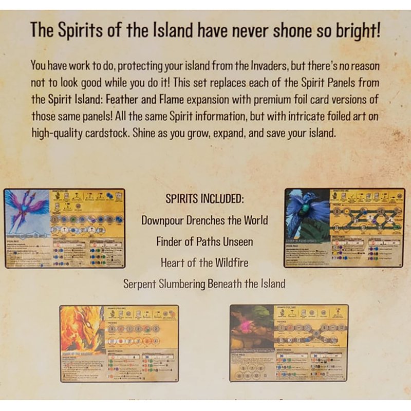 - This product is an accessory for the board game Spirit Island and requires the board game Spirit Island and expansion Feather & Flame to play.