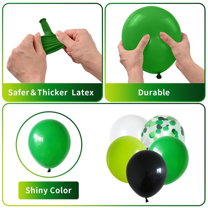 - ✨Well-coordinated party decoration: This balloon decoration set includes 15 x 12-inch matte dark green balloons, 10 x 12-inch matte lime green balloons, 13 x 12-inch matte white balloons, 12 x 12-inch matte black balloons, and 10 x 12-inch green, black, and white mixed color balloons with a shimmering metallic finish. To complete the look, we've included 1 roll of ribbon. Create a vibrant and eye-catching rich shades of green, accentuated by the sleekness of black and the purity of white.