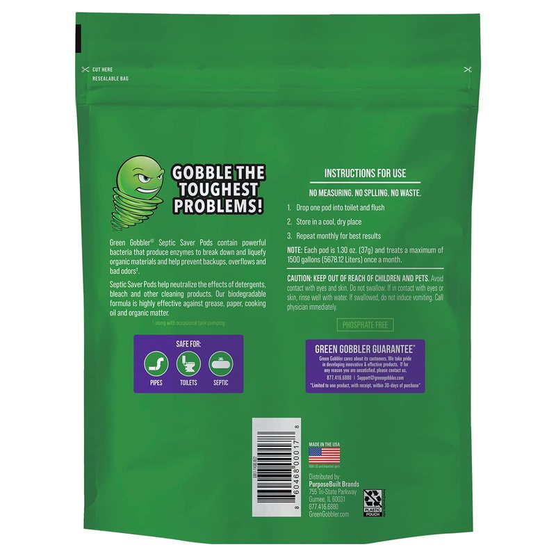 It's easy to maintain a healthy septic system with Green Gobbler Septic Saver Pods. Flushing one Pod a month can help you avoid significant sewage issues. Septic Saver Pods contain bacteria that produce enzymes to help break down organic materials. Pods can also help your septic system avoid the harmful effects caused by bleach, detergents and other chemical drain openers. This six-month supply of premeasured Septic Saver Pods will help you avoid headaches and costly repairs.