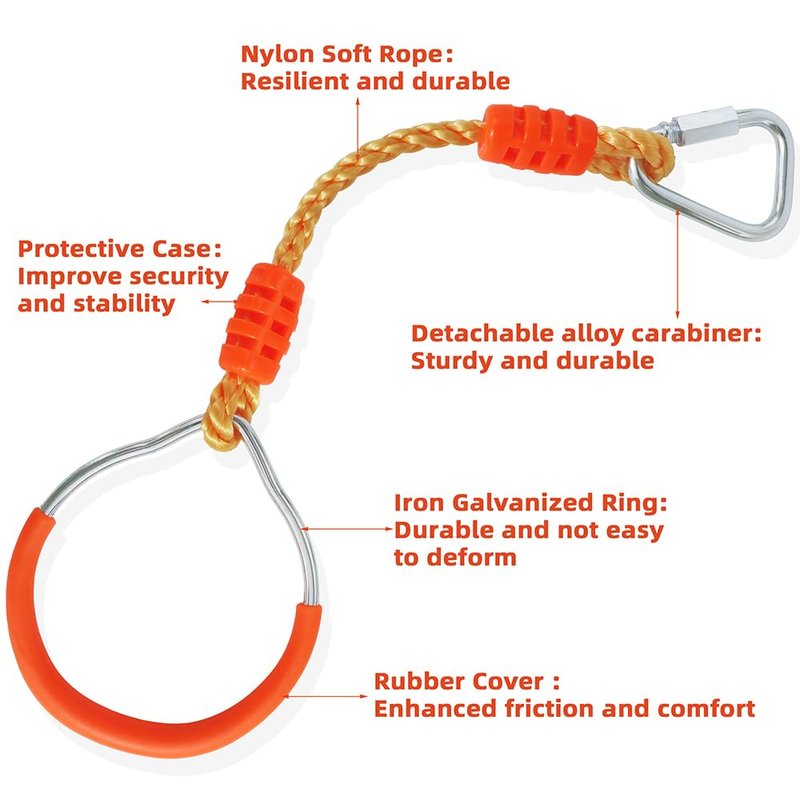 - HEAVY DUTY★ Our swing monkey bars gym rings, max weight 300 lbs, comfort experience from soft plastic covered rings design + sturdy and durable carabiner with safety locked + stronger rope, make sure kids and adult safety, it is one perfect gifts for kids.