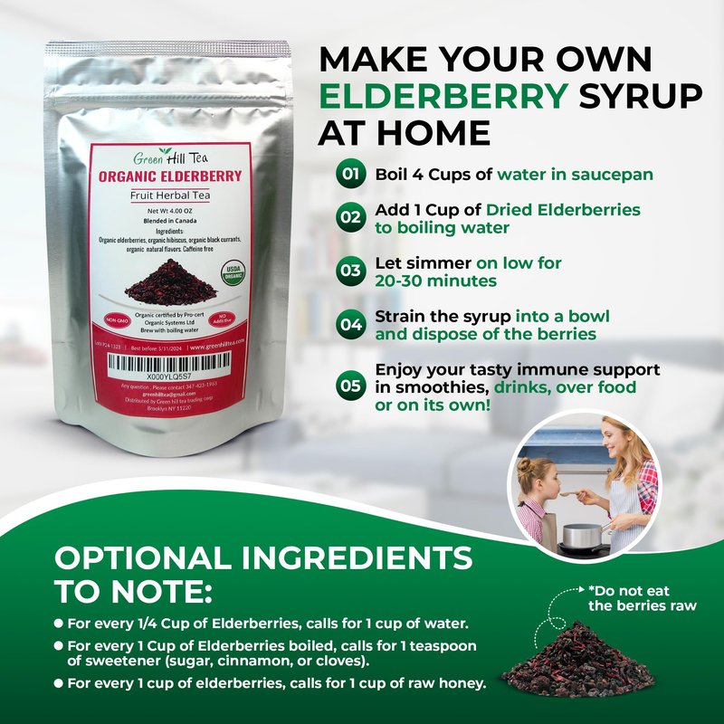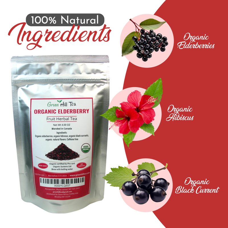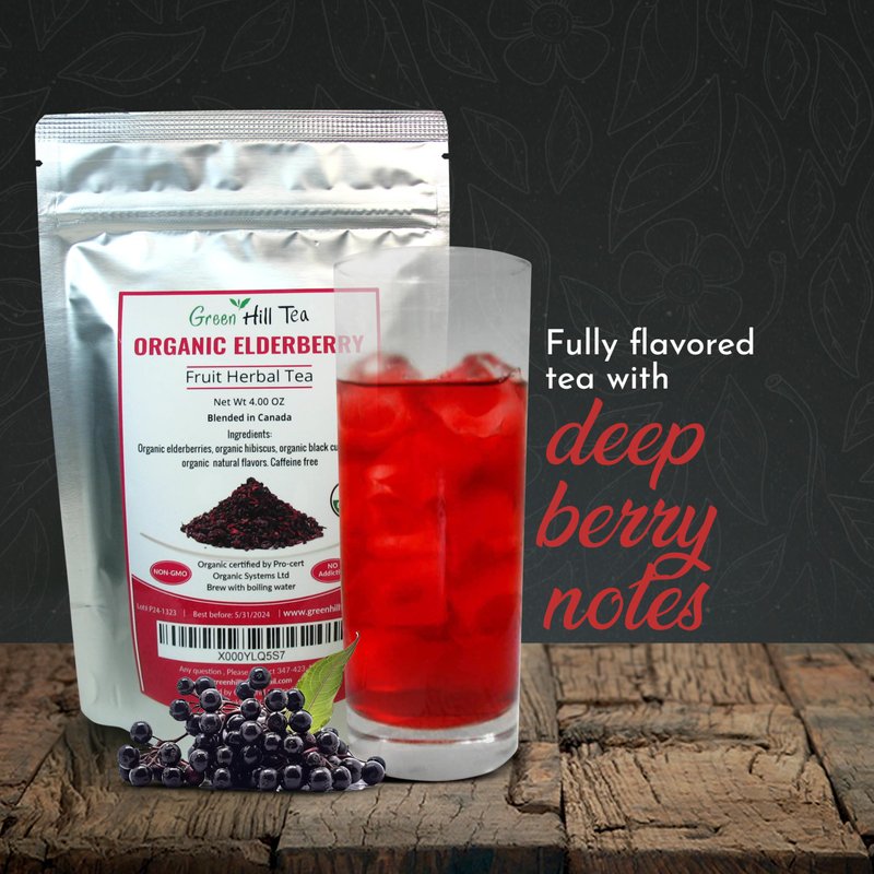 Green Hill Tea Organic Elderberry Herbal Tea - Immune System Boosting Loose Leaf Tea Blend - USDA Certified Organic - Caffeine-Free Relaxing Drink 4 OZ