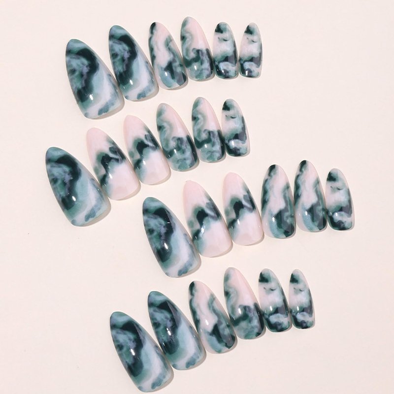 Green Marble Press on Nails Long Almond Fake Nails Mirror Acrylic Nails with Glue on Nails Full Cover Reusable Stick on Nails for Women DIY Charm Manicure