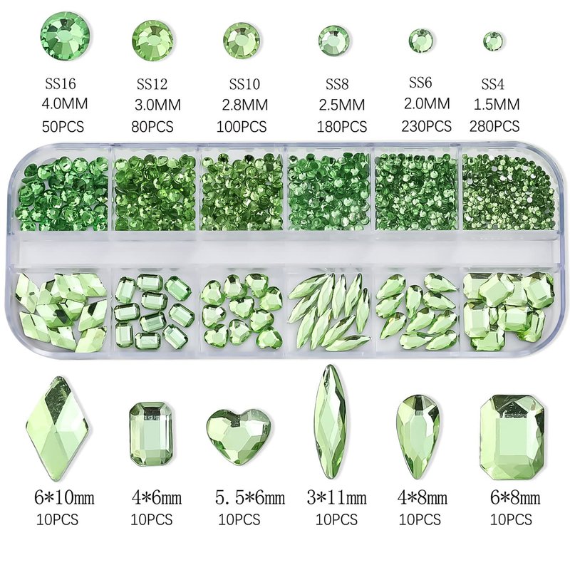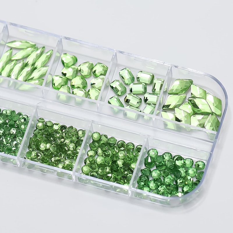 - 【Quantity】You will get 12 grids/box light green nail art diamonds, nail crystal rhinestones total 920pieces, various shapes for you to choose to decorate your own nails or handicraft. Which add sparkle and glamour to your crafts, make your nails more dazzling and charming.