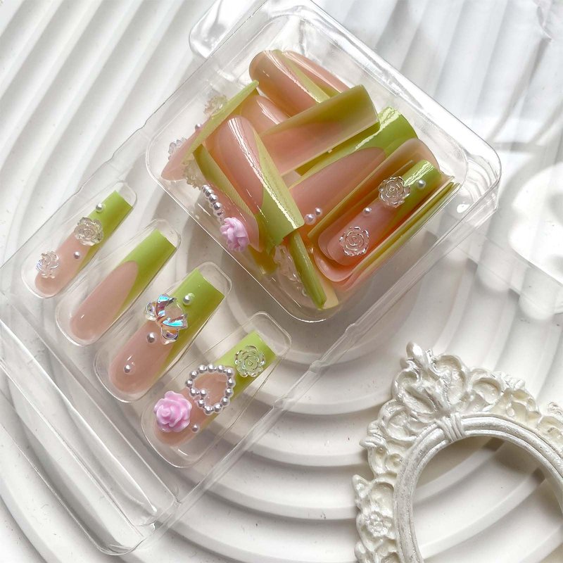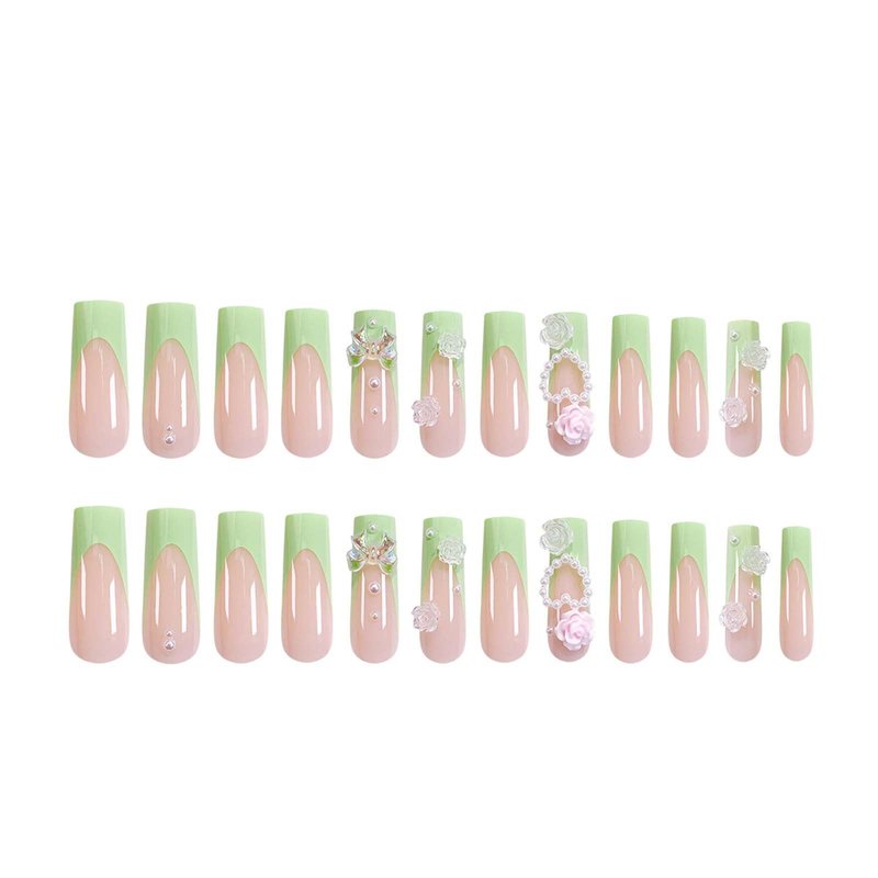 - Package Contains:1Box 24 Pcs green french tip press on nails, 24 pieces of jelly glue, 1 mini nail file, 1 wooden stick.Pink floral fake nails come in 12 different sizes, which are perfect for any finger.