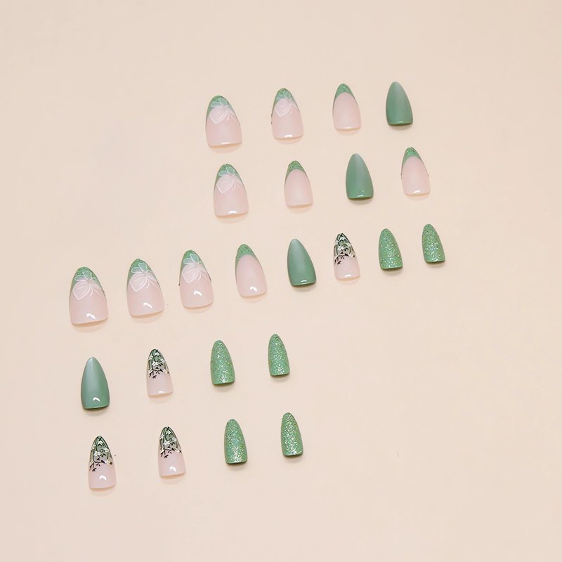 - 【Beautiful Design 】Our green press on nails almond flower are green flower and white butterfly design.The surface of the stiletto fake nails is glossy and thick, making it very comfortable to touch and irresistible.
