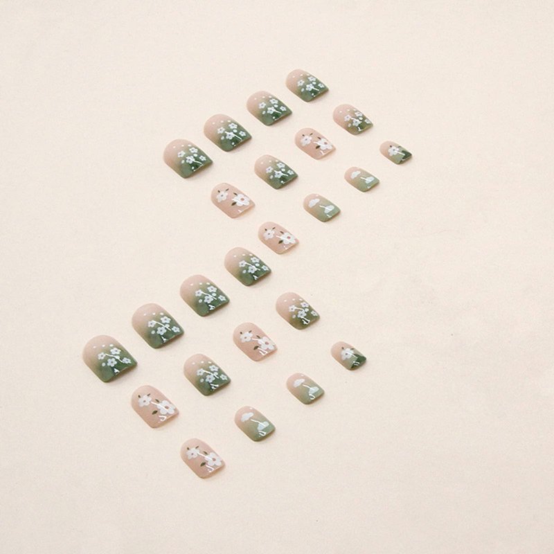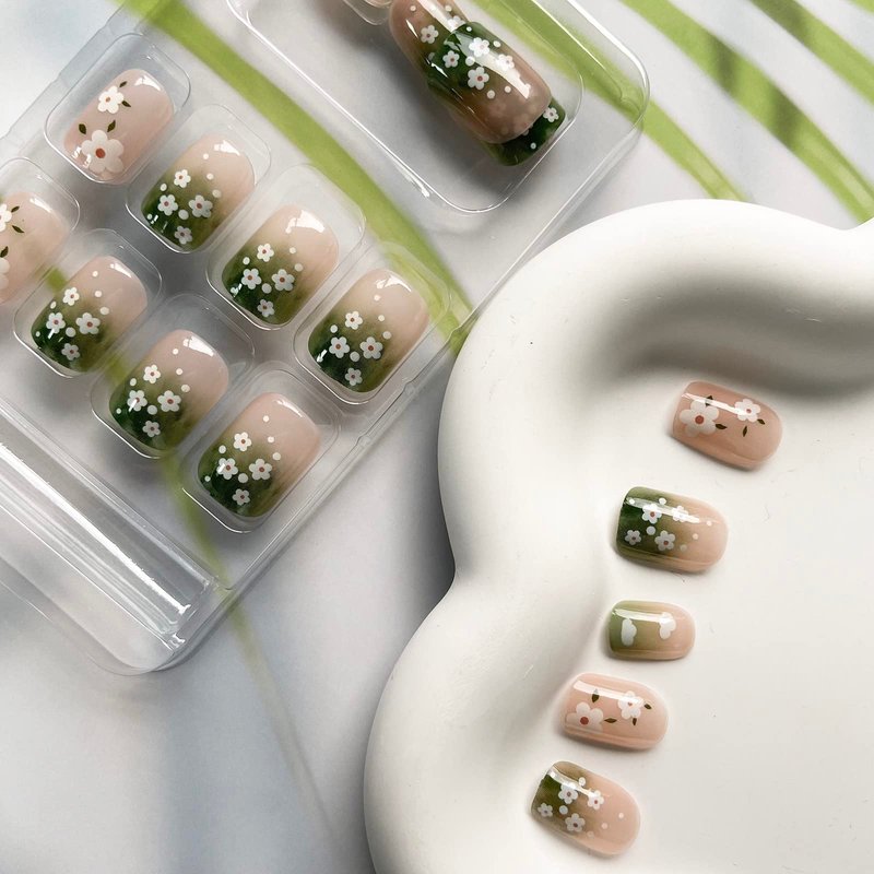 Flower Press on Nails Medium Fake Nails with Design Green false Nails for Women Girls Nail Decoration