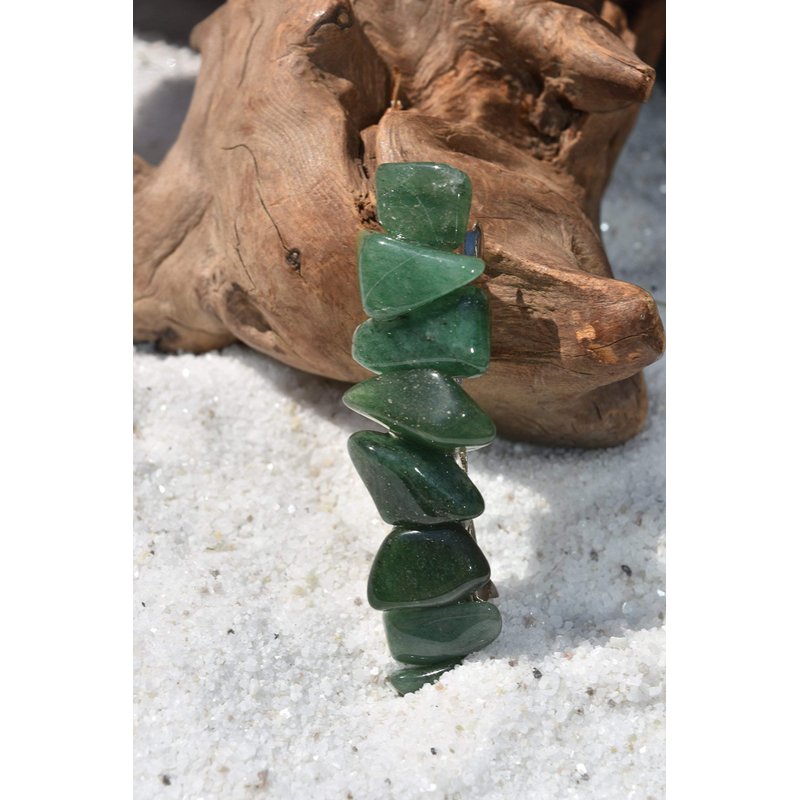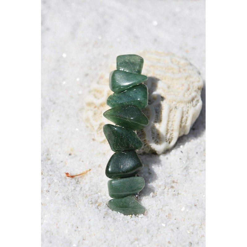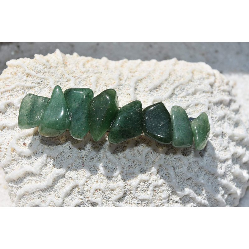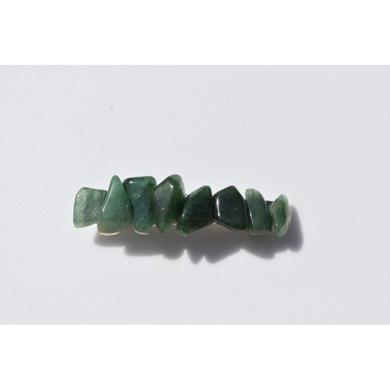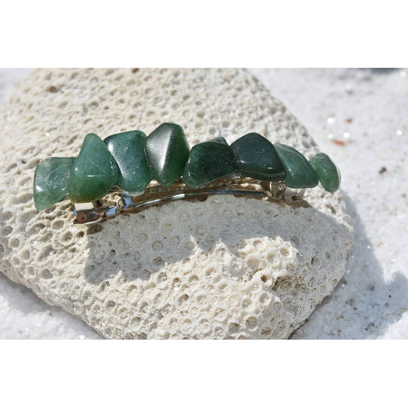 Pretty green quartz stone french barrette, the stones have a gorgeous coloring. The stone french barrettes are adorned with green quartz stones. The green quartz stone hair clip is the perfect accessory for a night out, and can dress up an outfit or be used for a special event, like a quinceanera, first communion, or even a wedding. The hair clip is hand made in the USA and come from a smoke free environment. The green quartz stone hair clip measure: 61 mm x 16 mm x 15 mm or 2.4 inches x .6 inches x .57 inches.