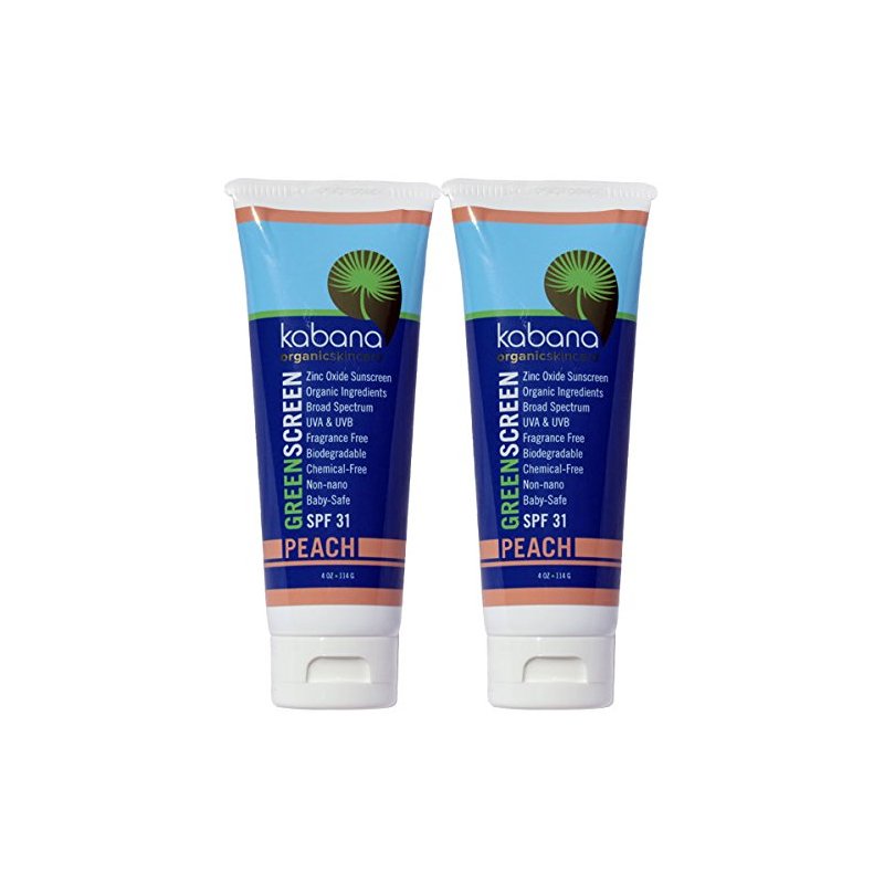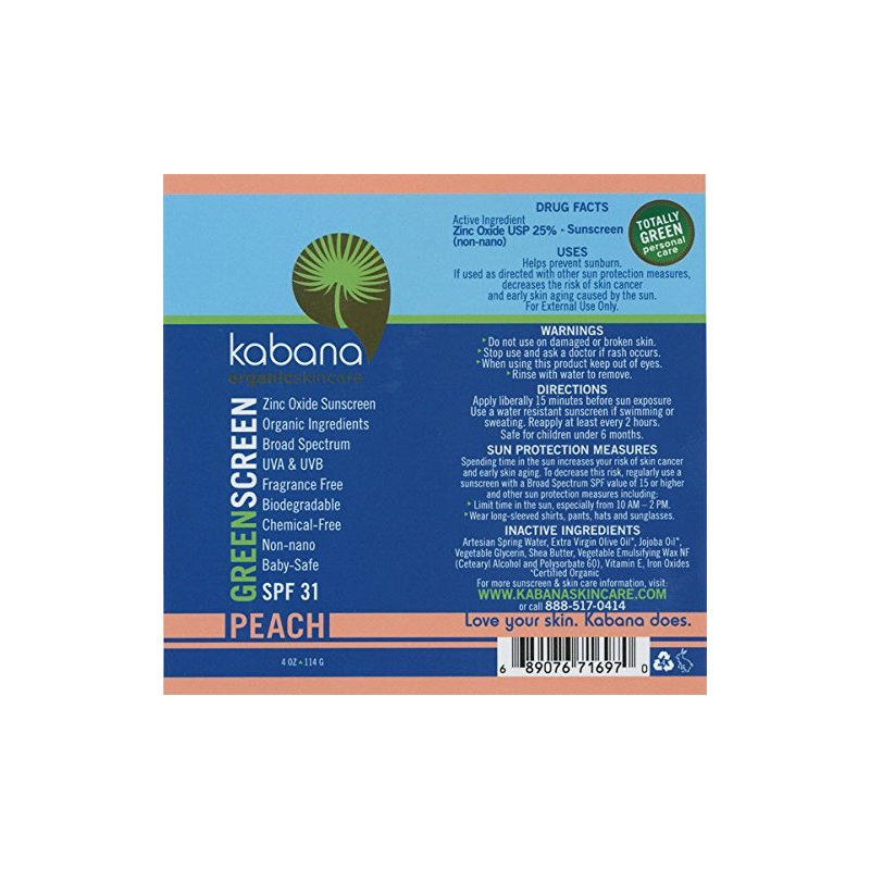 This formula has all the benefits of Green Screen Original SPF 32, but is tinted to blend with skin tones and is excellent for facial use. Peach is a pinkish beige tone created by the mineral cosmetic pigment iron oxide. Iron Oxide is the same biomineral that makes blood look red. Peach is designed for people who have skin with a warm pinker undertone, yet light complexion. Great for Northern and Eastern European heritage, with skin that can tan relatively easily. Excellent for facial use and may be applied to reduce blemishes and blend sunspots. Green Screen Organic Sunscreen SPF 31 Peach is easy to apply at all temperatures and blends with skin tones, eliminating the cool chalkiness that mineral sunscreens may impart. Green Screen Organic Sunscreen SPF 31 Peach is healthy, highly effective and safe for children and adults of all ages. SPF 31 provides 97% UV absorption. Formula is broad spectrum and effective for protecting your skin from both UVA and UVB radiation. You can use it daily and be confident that it's free of harmful petrochemicals that are known to bioaccumulate. Zinc oxide is a better sunscreen active ingredient than titanium dioxide and the only one Kabana uses for the following reasons: Zinc oxide the most effective UV absorber across the entire UVA and UVB spectrum. ZInc oxide is made from the critical mineral nutrient zinc instead of the toxic heavy metal, titanium. Zinc oxide holds tight to its electrons when it absorbs UV energy and limits the creation of free radicals that do damage and increase the risk of skin cancer. Zinc oxide is the sole sunscreen active ingredient approved for use on children by FDA. The zinc oxide Kabana uses is non-nano, and not-micronized (it is not crushed to size which produces nanoparticles); there are zero zinc oxide nanoparticles in our formulas.