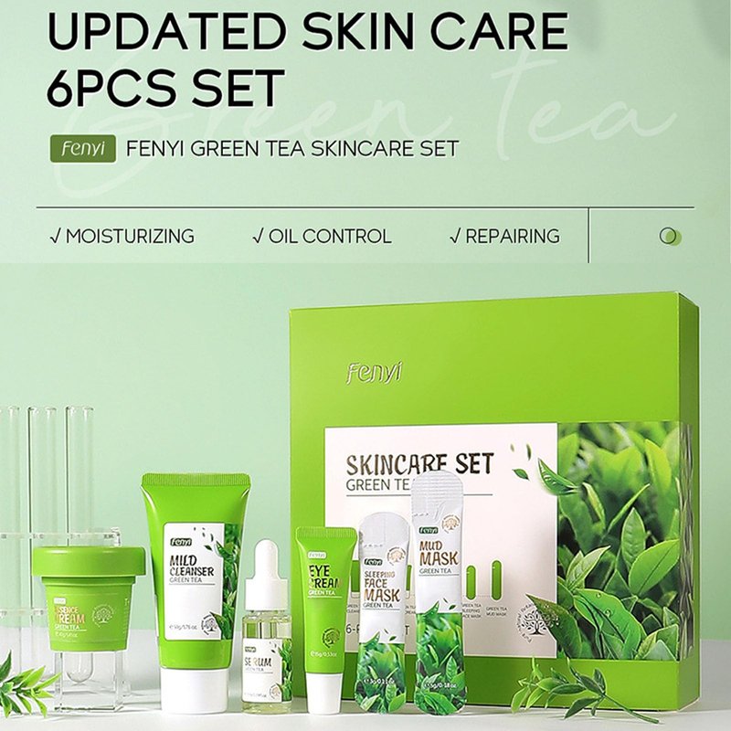 - 🌿【Green Tea Skin Care Set】This Skin Care Gift Box Set contains your favorite moisturizing necessities: facial cleanser, face serum, face cream, eye cream, facial mask, and mud mask. This skin care kit can replenish dry skin with water, help prevent skin dryness, and moisturize skin.