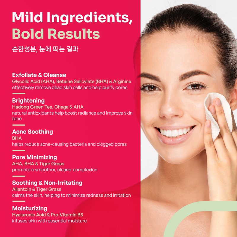 - GENTLE EXFOLIATION WITH NATURAL ELEGANCE – Delicately formulated with antioxidant-rich green tea from Korea's Hadong region, this face exfoliator is a dual-action marvel, offering soothing exfoliation. Our 150-pad set is enriched with AHA glycolic acid and a gentle form of BHA salicylic acid that exfoliate gently, minimizing pores and smoothing skin texture without irritation, making them perfect even for the most sensitive, acne-prone skin.