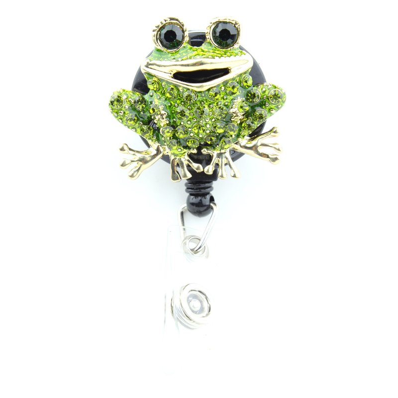 Green Toad Frog ID Badge Holder w/ Retractable Pull Reel & Crystal Rhinestones
