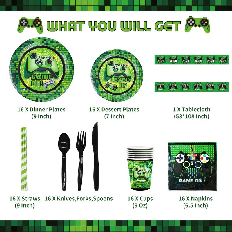 Package Contents ✔ 1 x Happy Birthday Banner ✔ 20 x 12-inch Latex Balloons (2 Styles) ✔ 2 x Foil Big Gaming Balloons ✔ 1 x Big Cake Topper ✔ 48 x Cupcake Toppers ✔ 16 x Knives ✔ 16 x Forks ✔ 16 x Spoons ✔ 16 x Straws ✔ 16 x 9-inch Plates ✔ 16 x 7-inch Plates ✔ 16 x 9oz Cups ✔ 1 x Tablecloths ✔ 16 x Paper Towels ✔ 12 x Hanging Swirls ✔ 3 x Balloons with Accessories