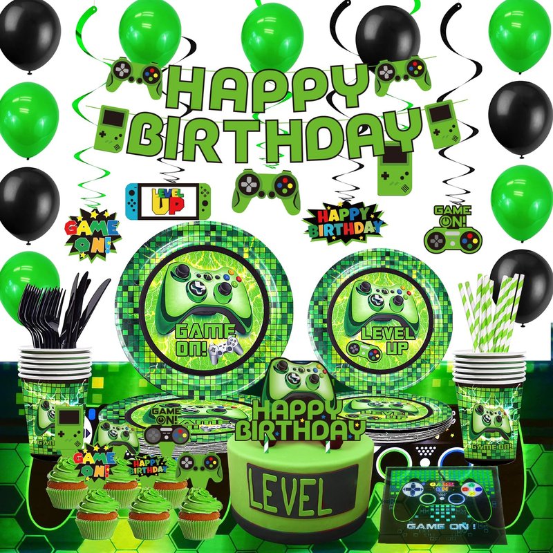 Green Video Game Party Supplies 201Pcs Gamer Gaming Party Decoration For Boys Birthday Party Table Cover, Plates, Cups, Napkins, Utensils, Hanging Swirls, Birthday Banner, Cupcake, Topper Cake