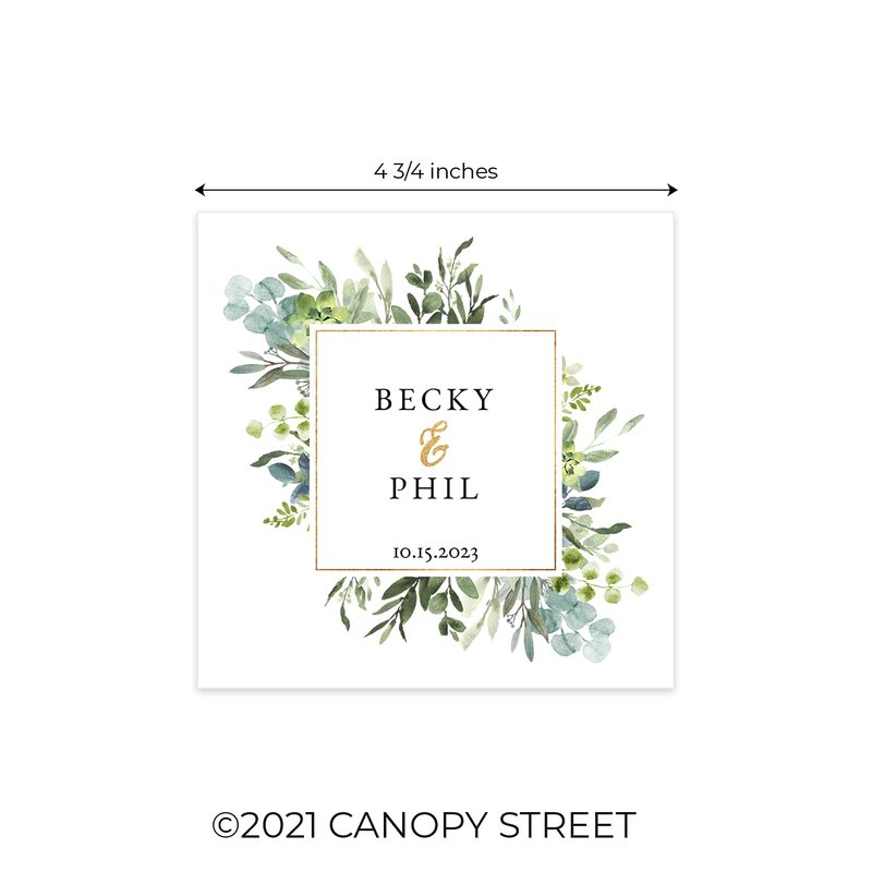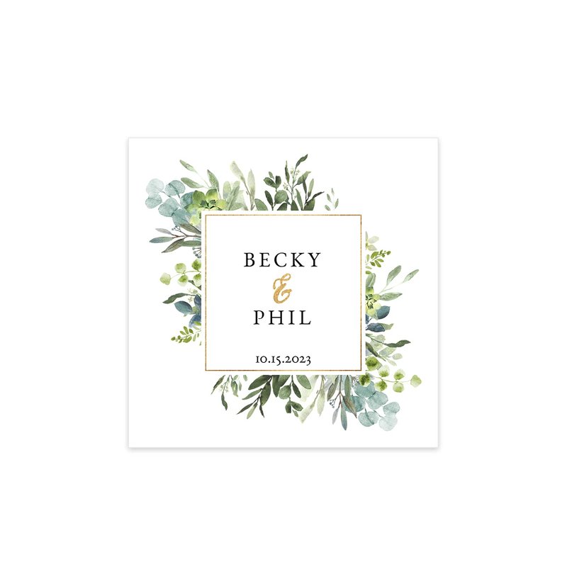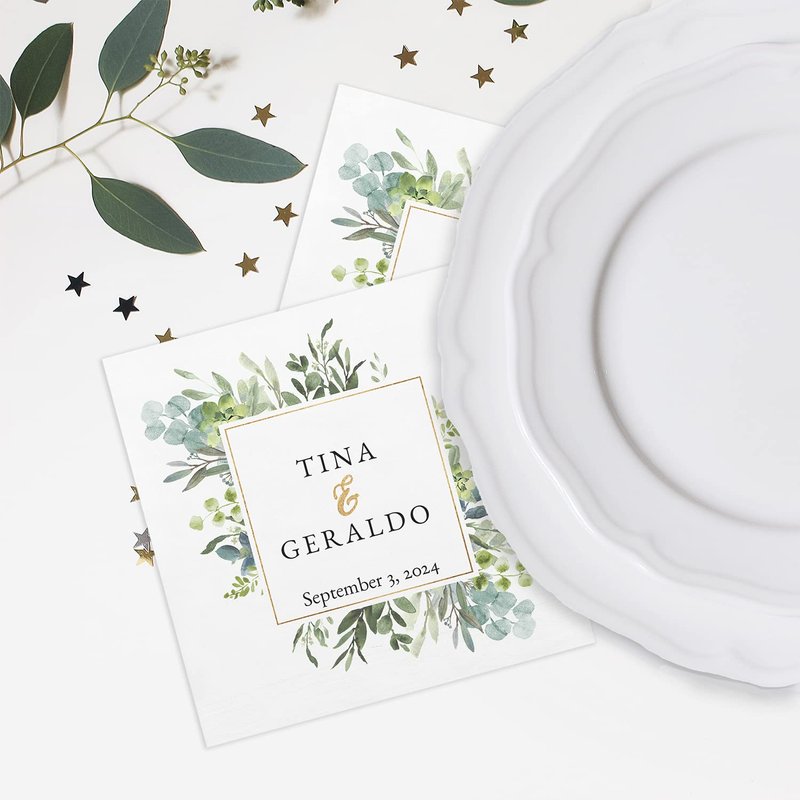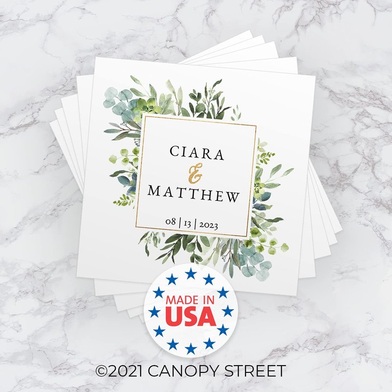 Add a personal touch to your celebration with these custom printed beverage napkins! This charming set includes 100 napkins with a gorgeous greenery design, 2 personalized names, along with an additional line of personalization. 4 3/4" x 4 3/4" square white napkins are printed in full color on one folded side. These modern cocktail napkins are perfect for celebrating a wedding, engagement party, or bridal shower with loved ones. Great for beverages, snacks, and desserts. Proudly made in the USA.