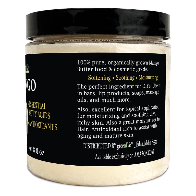 - USES: GreenIVe Mango Butter is Food Grade and can be used in a variety of ways. Use for DIY soaps or lotions. Comes in a variety of options for your personal needs. 8 Ounce Jar, 16 Ounce Jar, or 1 Pound Crumble