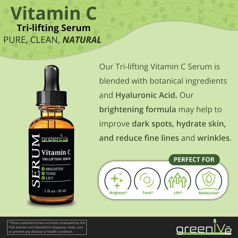 GreenIVe's Vitamin C Serum is a professional grade tri-lifting serum that delivers instant results. Instantly feel your skin lifting and tightening while finding a balanced skin tone. Plant powered skin care with Vitamin C, Hyaluronic Acid, Vegetable Collagen, and more.