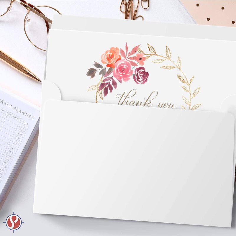 Express what’s in your heart and mind through personalized invitations, greeting cards, thank you notes, announcements, notecards and more with our 5" x 7" 80 lbs. heavyweight blank white cardstock and make it more meaningful to your family, friends, customers, clients, and employees. Comes with a matching amount of 28lb bond square flap A7 envelopes to fit the cards perfectly!