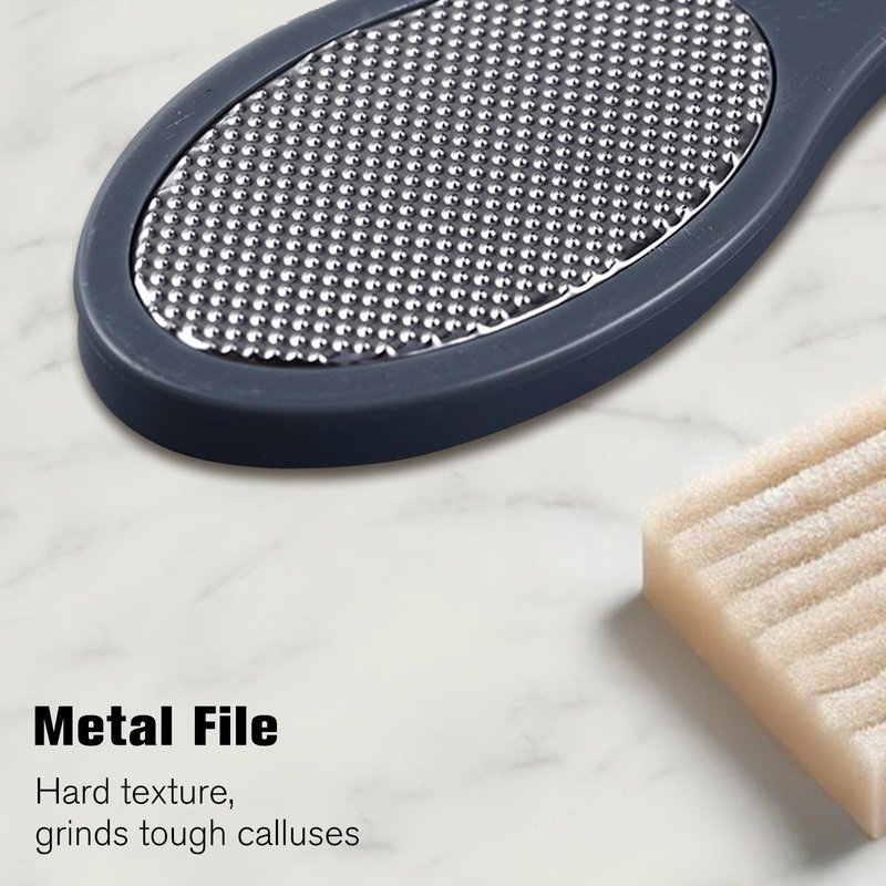 - Our foot care tool is a complete solution that includes a stainless steel foot file, foot scrub brush, pumice stone, and foot scraper, providing everything you need for comprehensive foot maintenance.