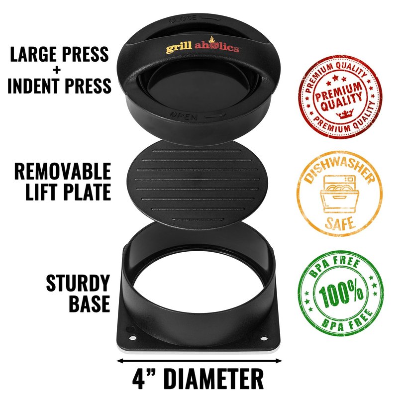 - NO MORE MESSY CLEANUP - Who wants to focus on cleanup after dinner? Nobody. That's why we specifically make the Grillaholics Stuffed Burger Press & hamburger patty maker press with premium materials that clean up easier than ever. The BPA-Free plastic used in our hamburger pattie maker ensures your burges slide in and out with ease. When done, simply soak in hot soapy water, or toss in the dishwasher and you’re on your way!