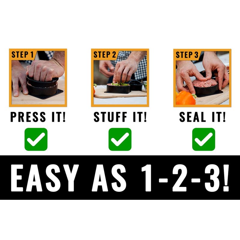 - FUN & EASY TO USE FOR THE WHOLE FAMILY - Our unique burger patty maker design is so easy to use that the whole family can get in on the fun! Your kids will love helping with dinner while they stuff their own burgers full of their favorite ingredients. With our burger maker press, making delicious stuffed burger patties is as easy as 1. 2. 3. Just press it. Stuff it. Seal it! You'll be asking yourself why you didn't pick up a burger maker sooner!