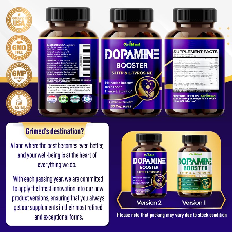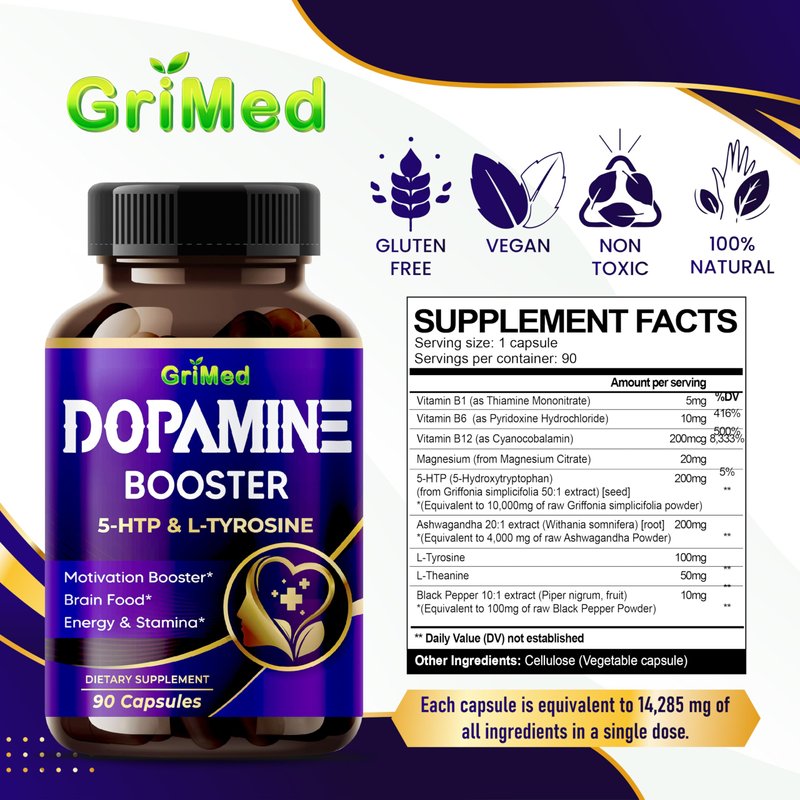 GriMed 5-HTP L-Tyrosine with Magnesium + L-Theanine - 14,285mg Energy, Stamina, Motivation Booster - USA Made & Tested (90 Count (Pack of 1))