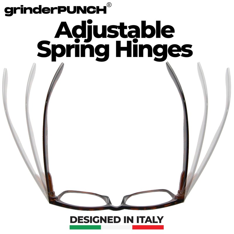grinderPUNCH High Power Quality readers are inspired by classic styles, to give the best of both worlds in function and style! These Retro 80's style glasses have spring hinges, which means they hyperextend. Weather you have a slim face or wide face, it'll stay on! Passed FDA inspection of shatterproof impact resistant lenses! UV400 Protection.