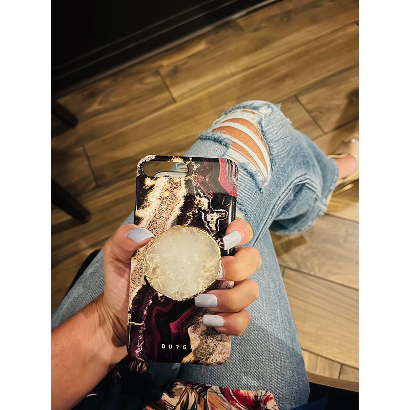 Manifest Like Magic with CRYSTALFY Phone Grips. Elevate your energy and attract positivity with CRYSTALFY's phone grips, powered by natural, authentic gemstones. A SELF-LOVE and SELFIE tool with a unique 360-degree rotating grip features a soft, ergonomic hold and expands or collapses easily with a built-in kickstand. The swappable crystal top, made from real gemstones brings the healing power of crystals into your everyday life. Reiki-cleared and charged with positive intentions, this phone grip promotes self-love, emotional balance, and a higher vibrational frequency. Upgrade your phone accessory game with a tool that nurtures your mind, body, and spirit while making you a magnet for good things. 🖤SHOP OUR FULL COLLECTION - Visit our storefront to discover a wide range of swappable crystal phone grips, offering unique designs and customizable options to match your style! 🖤WE HAND-SELECT OUR CRYSTALS TO ENSURE OUR HIGHEST STANDARDS ARE MET - These are actual photos (not stock images) of our crystals. Photo lighting and screens/monitors may make colors appear slightly different. The crystalline structure of the crystal can have natural blemishes, colors, cracks and holes that are beautiful in their natural way. 🖤GRIP IT. STAND IT. SPIN IT. SWAP IT - Our phone grip features a soft silicone base for comfort, a swappable crystal top that spins 360 degrees, and a design that expands with a pull, collapses with a push, and kicks out as a stand for hands-free video streaming. 🖤100% AUTHENTIC & UNIQUE - These are natural gemstones made by nature, not mass-produced, each piece one-of-a-kind in shape, size, and look. No two crystals are identical, so you’ll notice variations in color, size, veining, opacity, light-reflecting lustre, and hardness. As real crystals, they are heavier and thicker than standard plastic grips, offering a premium, authentic feel. 🖤PACKAGED WITH LOVE & LUXURY IN A VELVET BAG FOR SWAPPING CRYSTALS AND GIFTING - Packed with loving vibes in a black velvet bag great for gifting and carrying extra CRYSTALFY crystals to swap. 🖤THE NITTY GRITTY - Uses advanced reusable adhesive that is repositionable and washable. PLEASE NOTE: The base of the crystal phone grip adheres to most hard plastic cases but may not adhere well to some soft/silicone, waterproof or heavily textured cases (ie.,leather or glitter). Will not stick to waterproof, glass-backed phones iPhone 11 Pro or iPhone 11 Pro Max without a suitable case. 🖤HOW TO ATTACH PHONE GRIP- 1. Crystal & phone should be at room temperature 2. Clean phone or case with alcohol & dry. 3. Peel white sticker from back of phone grip. 4. Position grip & press firmly holding the edge of crystal for 3 minutes or more. 5. For strong adhesion, do not use grip for 3 hours or more. 6. Extra sticker included for future use when changing cases. 7. Handle with care preventing falls or impact to hard surface. Extreme temperatures, water or sunlight can weaken the crystal. 🖤HOW TO SWAP YOUR CRYSTAL – 1. Fully expand grip open. 2. Pinch or press in center part of gripper. 3. While pressing center of grip, turn the crystal top to twist the tabs loose from the 4-tab openings. 4. To swap the new crystal on the gripper, line up the 4-tabs under the crystal with the openings on the top of the gripper. 5. Insert the 4 tabs in each opening and twist the crystal top to ensure tabs under the crystal are locked in place.