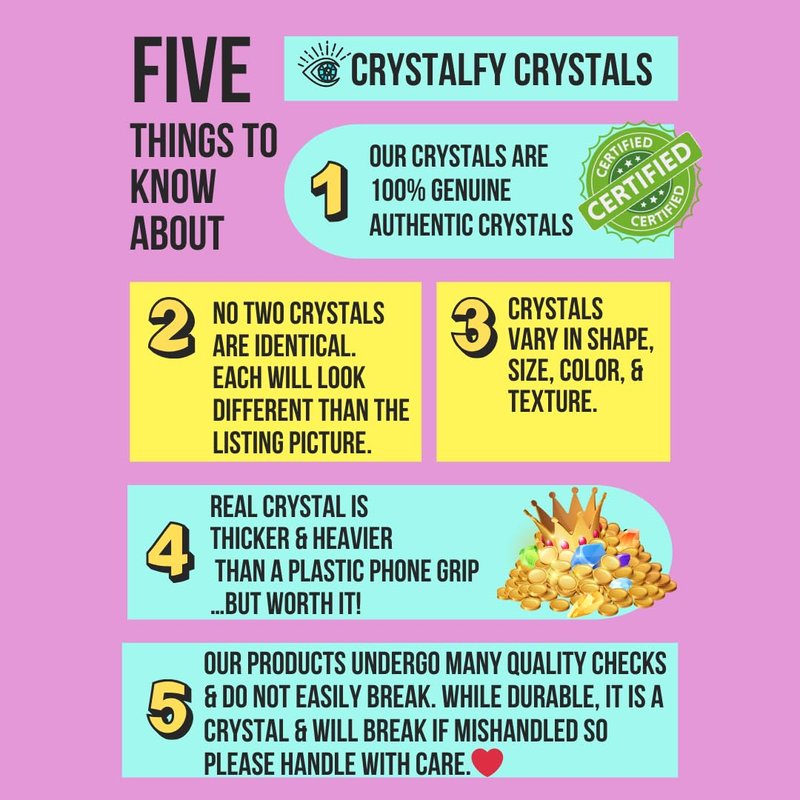 - CONNECT WITH NATURE – Every crystal phone grip top is a genuine a one-of-a-kind crystal gemstone; no two are alike. Our crystals are hand-selected to ensure our highest standards are met. PLEASE NOTE these are actual photos of our crystal phone grips, but there will be variations in color, size, shape, opacity, veining and texture from what is shown. Our crystals are beautiful creations from earth, so there may be some natural imperfections.