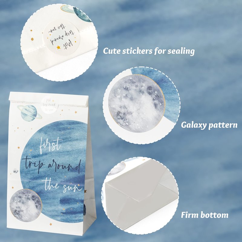- Sun Space Theme Design: Party bags and stickers are printed with many space-themed patterns, such as the rockets, moon, stars, earth and other planets; and the text "First trip around the sun". It would be a great goodie bag for a space theme party!