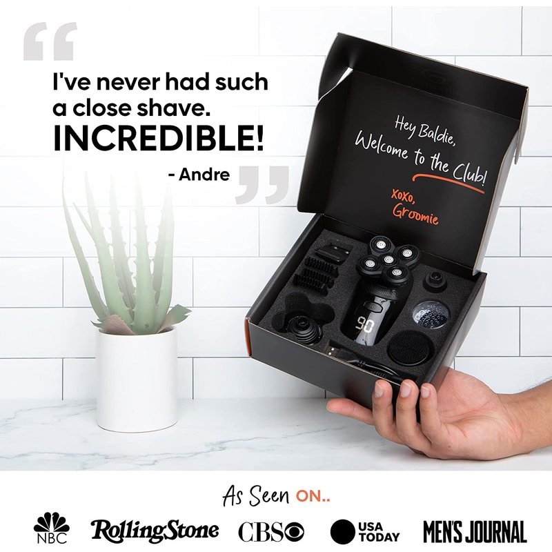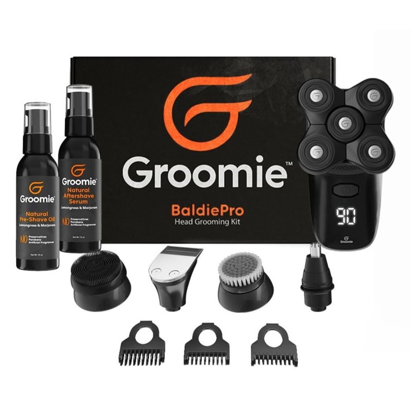- NO HAIR, DON'T CARE: The Groomie bundle has everything you need to take care of your grooming needs. With the 10,000 RPM BaldiePro Skull Shaver , our specially formulated plant based pre shave oil that is safe for sensitive skin, our natural aftershave serum to tend the skin and prevent bumps.